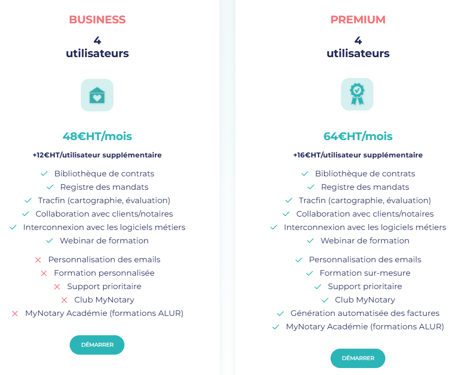 Les fonctionnalités sont quasiment les mêmes. A l’exception qu’avec le pack business, vous n’aurez pas accès au Club MyNotary et vous n’aurez pas accès aux formations personnalisées et un responsable client dédié.