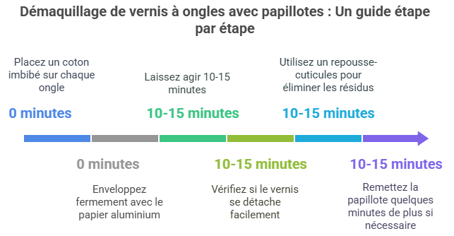 Parmi toutes les techniques de dépose, nous recommandons particulièrement la méthode des papillotes, reconnue pour son efficacité et sa facilité d'exécution. Cette technique permet à l'acétone d'agir progressivement sur le vernis sans agresser excessivement l'ongle. Voici comment procéder étape par étape :