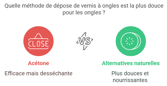 L'acétone, bien qu'efficace, peut dessécher vos ongles et les cuticules environnantes. Si vous recherchez des méthodes moins agressives, nous avons testé pour vous plusieurs alternatives naturelles qui, bien que moins rapides, préservent davantage l'intégrité de vos ongles.