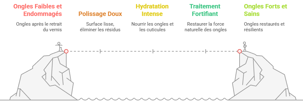 Une fois le vernis complètement retiré, vos ongles méritent des soins particuliers pour retrouver leur force et leur éclat naturel. Nous vous recommandons de laisser vos ongles respirer quelques jours avant une nouvelle application de vernis, particulièrement si vous enchaînez les poses de semi-permanent.