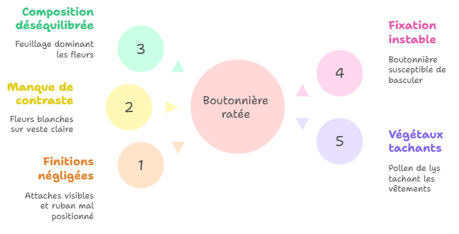 La première erreur concerne le choix des végétaux. Les fleurs trop fragiles ou inadaptées à une utilisation sans eau constituent un écueil majeur. La boutonnière, portée plusieurs heures durant, subit de nombreuses contraintes : absence d’hydratation, frottements, chaleur corporelle et mouvements divers.