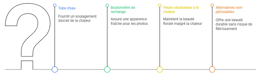 La dernière erreur, et non des moindres, consiste à ignorer les conditions pratiques du jour J. Une boutonnière magnifique en atelier peut devenir décevante après quelques heures en plein soleil. Pensez aux solutions alternatives pour les mariages estivaux ou en conditions difficiles.
