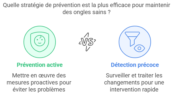 Enfin, surveillez attentivement tout changement d’aspect ou d’épaisseur de vos ongles. Une détection précoce permet un traitement plus rapide et efficace, vous évitant des complications potentiellement douloureuses et des traitements plus longs.
