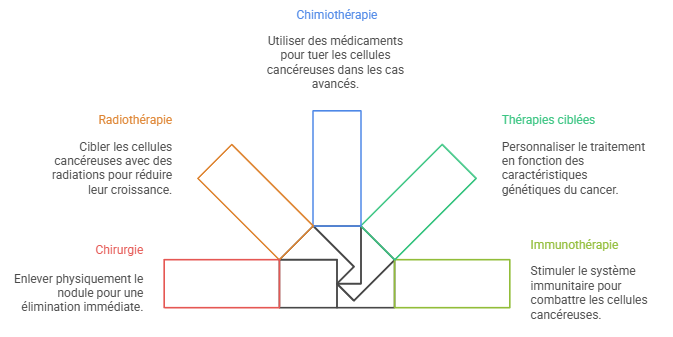 Lorsqu’un nodule est suspecté d’être malin, des interventions plus actives peuvent être nécessaires. Les options thérapeutiques comprennent :